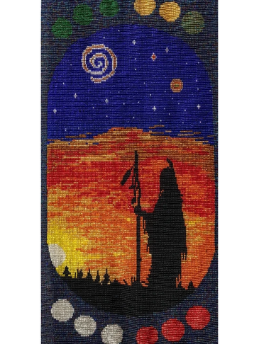 This tapestry was designed to reflect the teachings in Jamie Sams’ book “The Thirteen Original Clan Mothers.” Jamie Sams’ gained her wisdom from her grandmother, and it reflects the feminine spirituality based on self-actualization. This is the Clan Mother of the 8th moon, and her sacred colour is blue. This can be seen in the 12 moons
