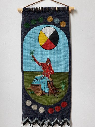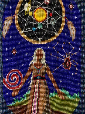 This tapestry was designed to reflect the teachings in Jamie Sams’ book “The Thirteen Original Clan Mothers.” Jamie Sams’ gained her wisdom from her grandmother, and it reflects the feminine spirituality based on self-actualization.