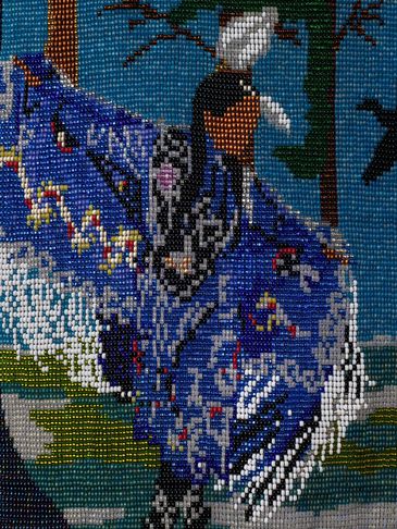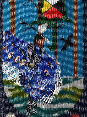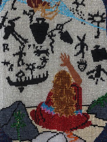 When Marybeth envisioned this clan mother, she imagined her as a traditional dancer. Her shawl moves and dances with her as she expresses her own individuality. The petroglyph (turtle) reminds us that we all live on turtle island. Within the turtle are the sacred colours which represent the four directions and a reminder that we are all brothers and sisters.