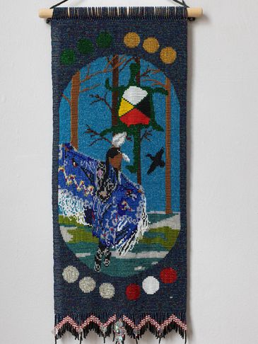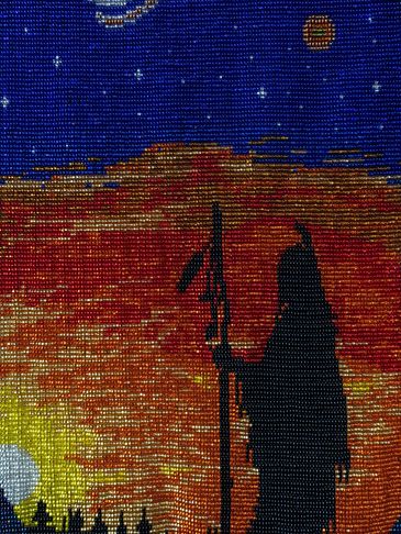 This tapestry is the artist’s interpretation of the Clan Mother of the 11th moon. This Clan Mother’s sacred colour is white. This can be seen in one of the 12 moons which are divided in 4 sets of colours around the body of the tapestry. This Clan Mother brings with her the gift of Guardian of Leadership and the Keeper of New Paths. The lessons that we gain from this Clan Mother are how to lead by example instead of demanding that others follow. We learn that to change our life situation we must take our own actions instead of relying on others to do it for us.