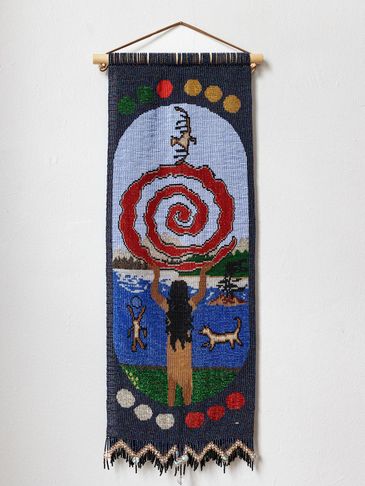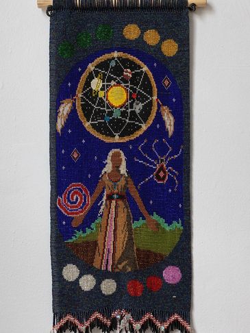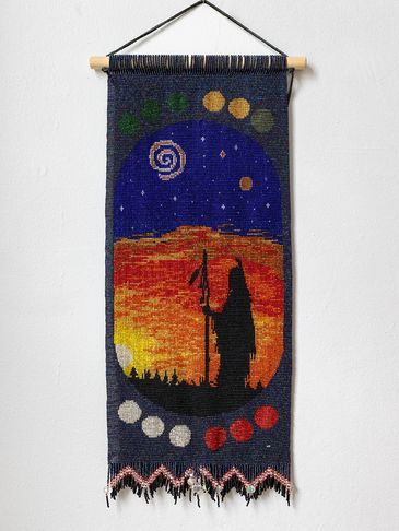 This tapestry was designed to reflect the teachings in Jamie Sams’ book “The Thirteen Original Clan Mothers.” Jamie Sams’ gained her wisdom from her grandmother, and it reflects the feminine spirituality based on self-actualization. This is the Clan Mother of the 8th moon, and her sacred colour is blue. This can be seen in the 12 moons which are divided in 4 sets of colours around the body of the tapestry.