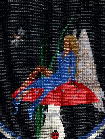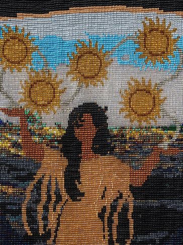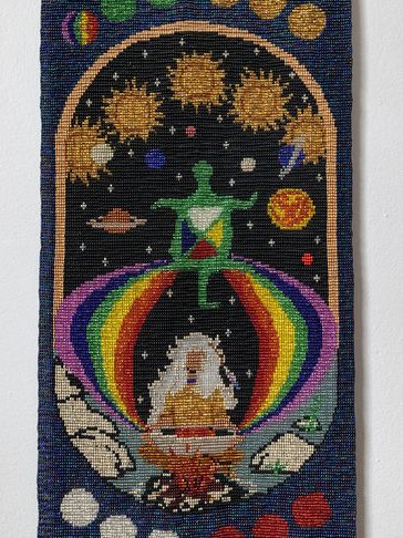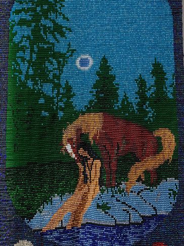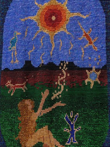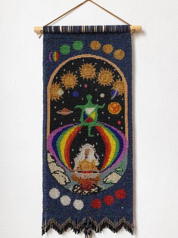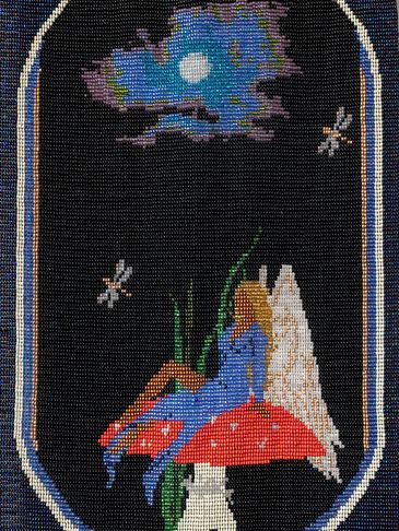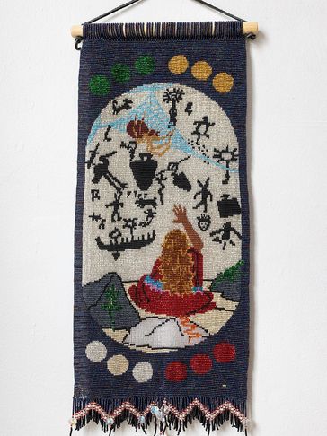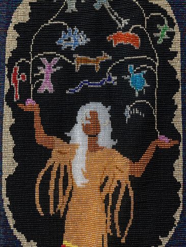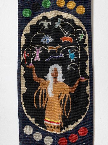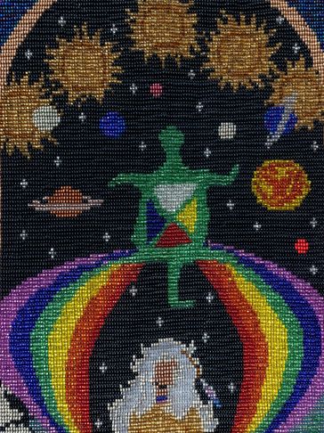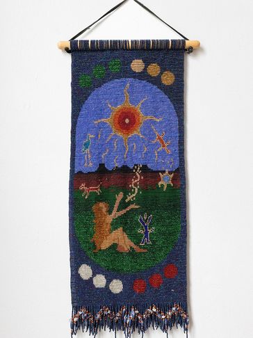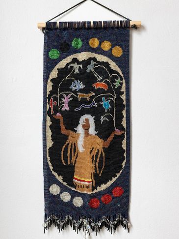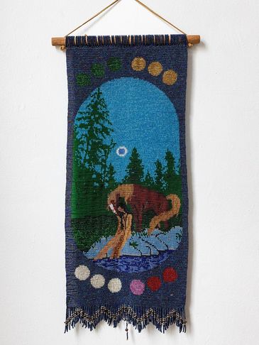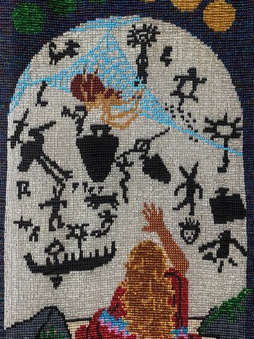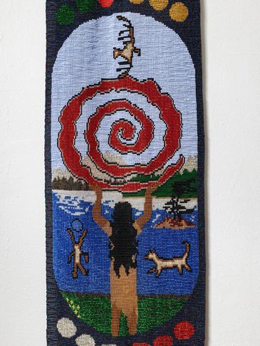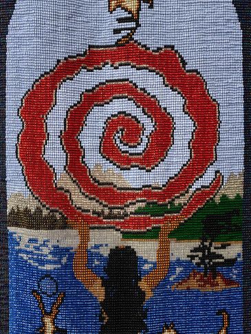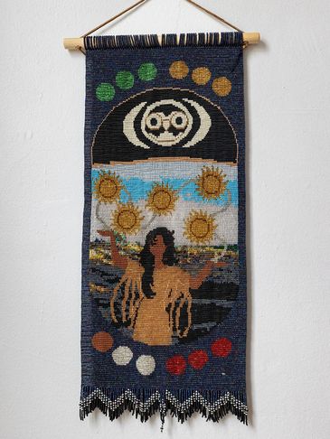 This is the Clan Mother of the 4th moon, and her sacred colour is all pastel colors. This can be seen in the 12 moons which are divided in 4 sets of colours around the body of the tapestry. This Clan Mother is