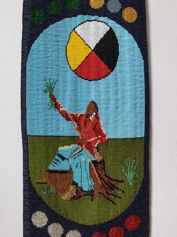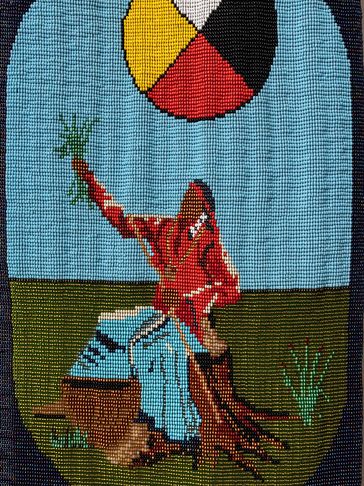 This tapestry was designed to reflect the teachings in Jamie Sams’ book “The Thirteen Original Clan Mothers.” Jamie Sams’ gained her wisdom from her grandmother, and Gives Praise – Giving Thanks for the Truth