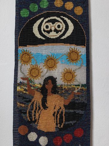 This tapestry is the artist’s interpretation of the Clan Mother of the 11th moon. This Clan Mother’s sacred colour is white. This can be seen in one of the 12 moons which are divided in 4 sets of colours around the body of the tapestry. This Clan Mother brings with her the gift of Guardian of Leadership and the Keeper of New Paths. The